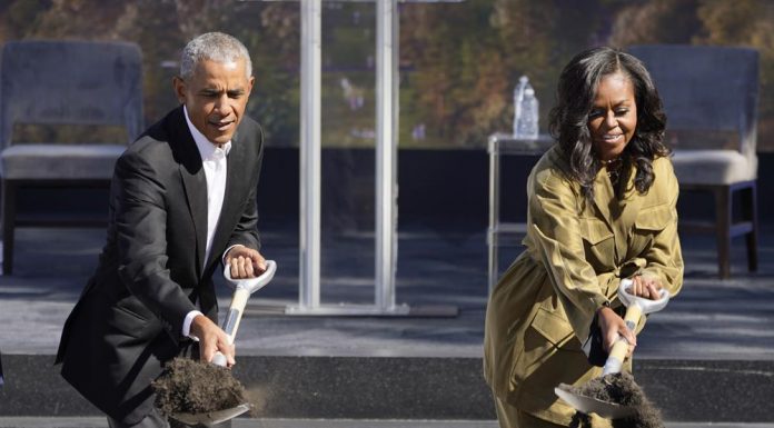 CHICAGO (AP) — After five years of legal battles, gentrification concerns and a federal review, Barack and Michelle Obama dug shovels into the ground Tuesday during a celebratory groundbreaking on their legacy project in a lakefront Chicago park.